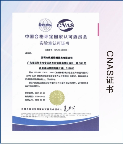 深圳市优耐检测技术有限公司 地址:深圳市宝安区西乡街道铁岗社区宝田一路365号嘉皇源科技园附楼2楼