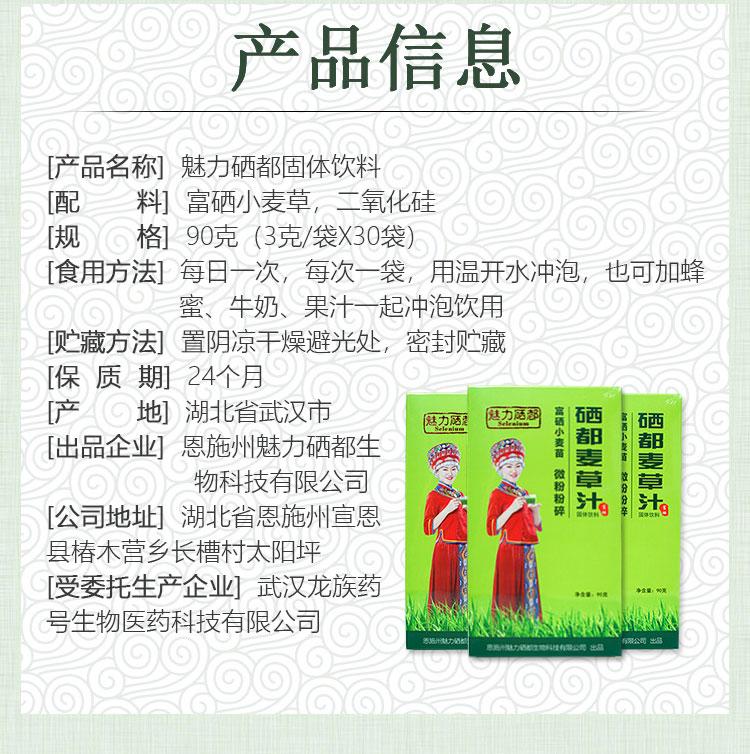 产品名称 魅力硒都固体饮料 配料 富硒小麦草、二氧化硅 规格 90克(3克/袋x30袋)