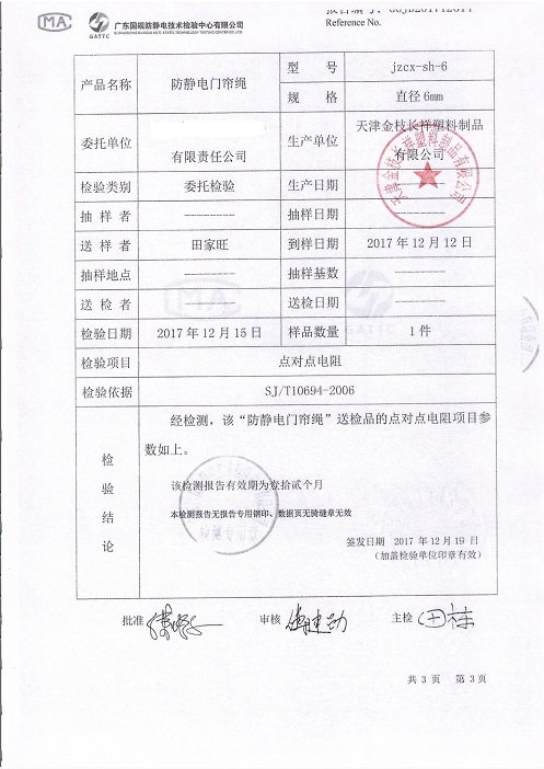 检测报告:直径6mm防静电门帘绳比电阻1.0×103Ω/m. 垂绳间距:推荐采用2厘米或5厘米.