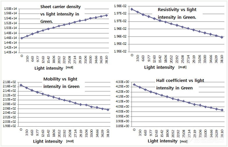 通过HMS-7000主机及霍尔效应测试仪软件控制光源及马达自动完成测试,并绘制出载流子浓度、迁移率、电阻率及霍尔系数随光源强度变化的曲线如下: