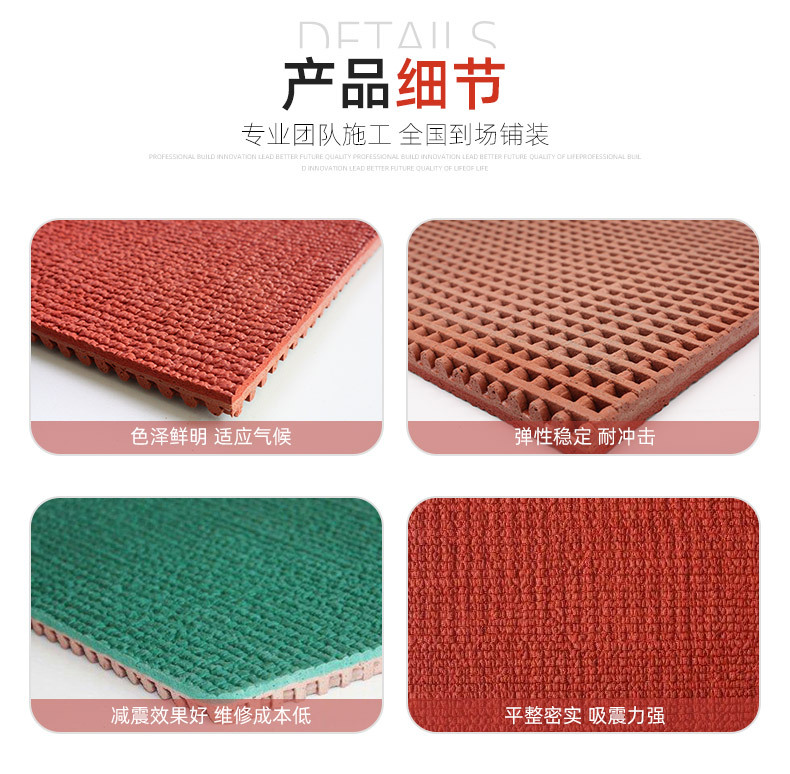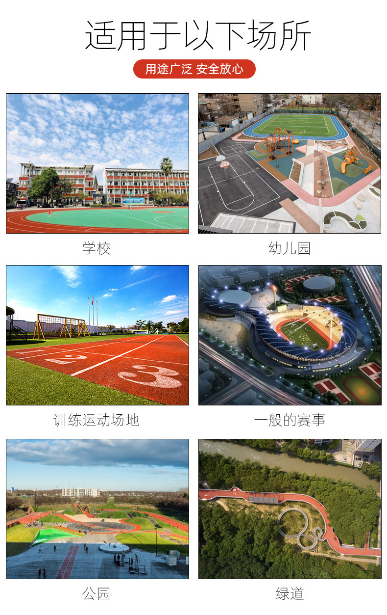 5、全天候使用、弹性好、耐磨性强、耐候性佳、耐压缩性强、抗钉力强、耐冲击力佳;