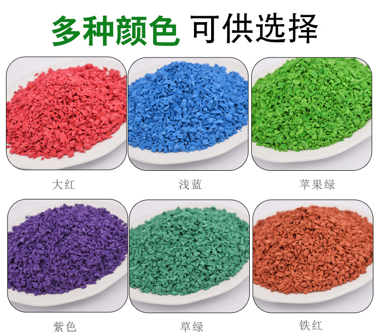 2、各种颜料橡胶颗粒或EPDM颗粒为面层,黑色橡胶颗粒为底层。
