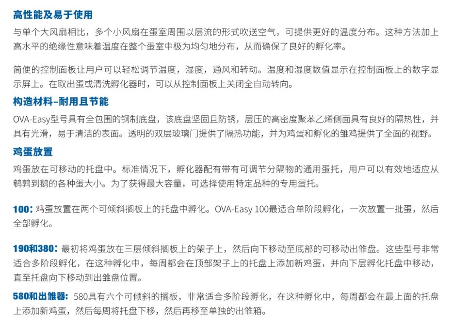 新型OVA-Easy 580 Advance II鸡蛋孵化器旨在以合理的价格提供蕞佳性能。孵化器设计的每个方面都经过了审查,目的是确保比起其他的种蛋孵化器,能为您提供用低成本孵化出高质量的幼雏。