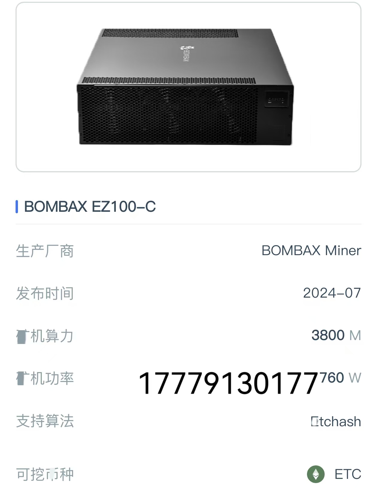 这款服务器的功耗为760W,支持ETHash和ETCHash算法,算力高达3800 MH/s。在挖掘过程中,BOMBAX EZ100-C展现了其卓越的性能。其采用的ETHash和ETCHash算法,不仅提高了挖掘效率,也降低了功耗。