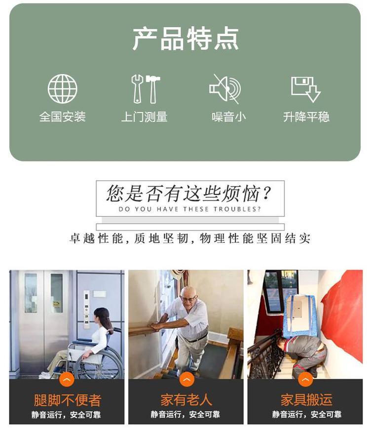 齐力机械家用升降机是平台、导轨和驱动箱等三大部分组成;是由50方管为主体部件,采用无基坑式安装,直接固定于混凝土地面(无底坑室外应用情况下,平台下方混凝土地面不得低于周围地面) 液压驱动,升降平稳安全,外部采用拉丝不锈钢材料和铝板静电喷塑机箱/面板,外形小巧美观,不阻碍周边环境,维护简便。