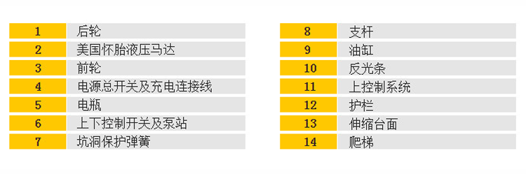 2、有底座、臂架和工作台三部分组成。底座采用相应强度钢板焊接而成;臂架为剪撑铰链式垂直升降。