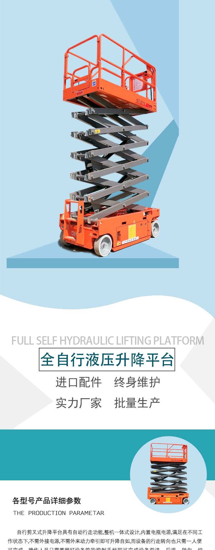 我公司生产的自行剪叉式液压高空作业平台采用美国TROJAN蓄电池动力驱动行走,不需外接电源及人工牵引,可变频调速及转向驱动功能。车身外型美观,操作简单。
