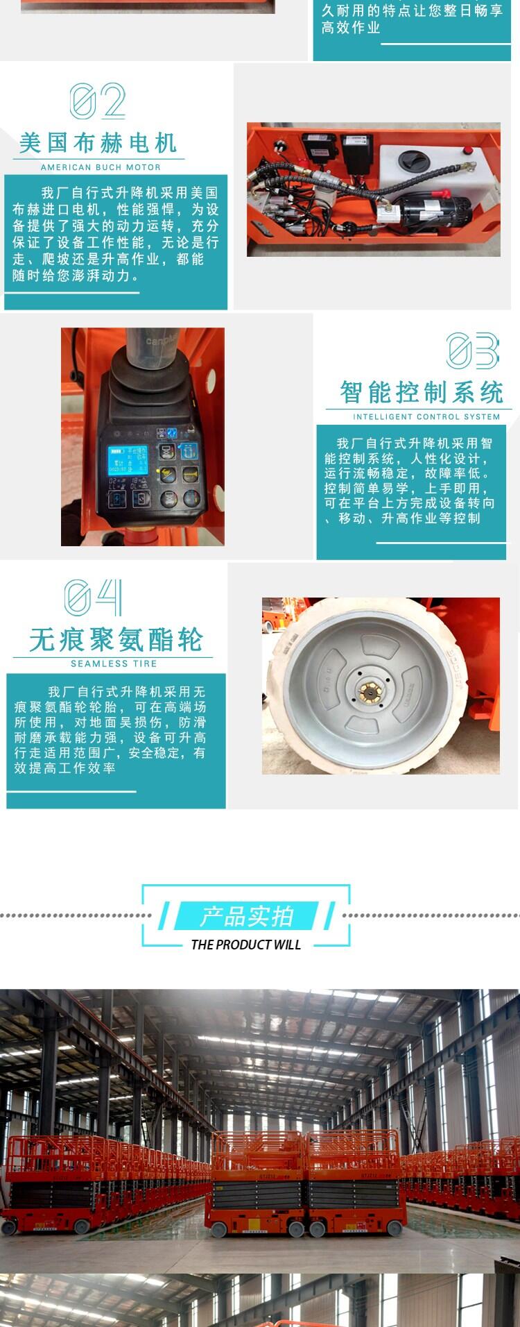 产品主体采用Q345优质结构锰钢,高精度加工设备制造。采用美国怀特液压驱动系统,配置防爆管装置,紧急停止按钮,升降、行走通过液压驱动实现。内部装有故障诊断系统、油管防爆系统、自动刹车系统、紧急下降系统、充电保护系统、倾斜保护系统等安全装置。产品具有智能化强,移动转移方便,作业效率高等特点。在保证安全可靠的前提下优化产品控制模式和控制程序,操作更赋人性化。