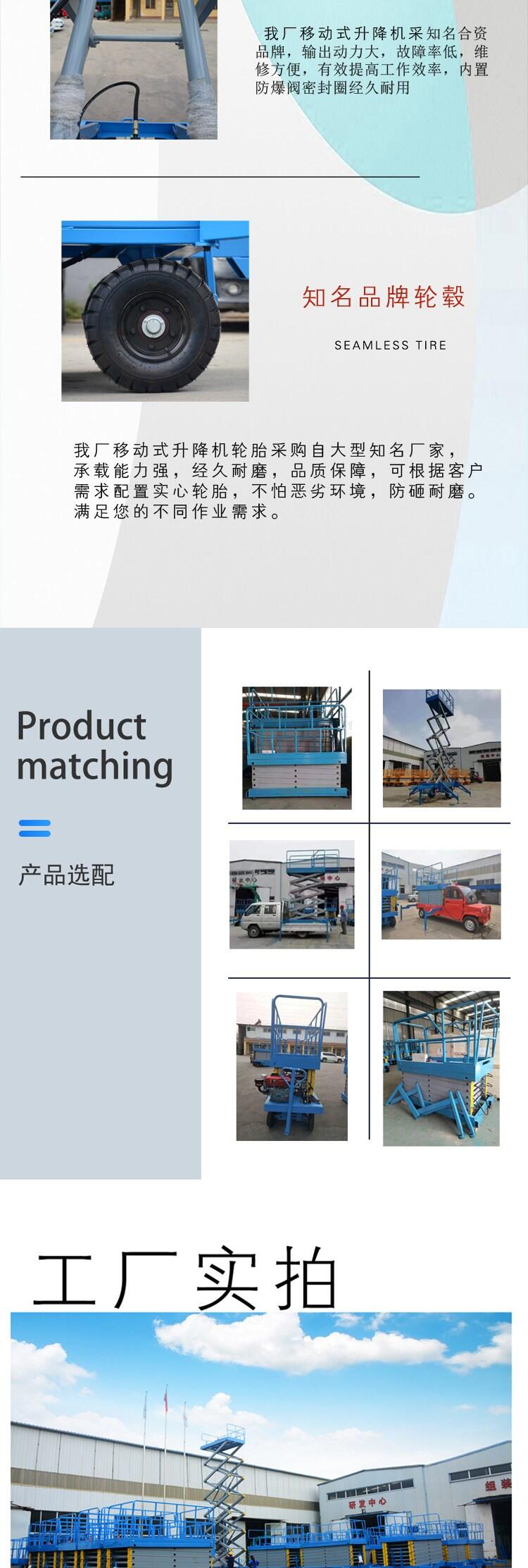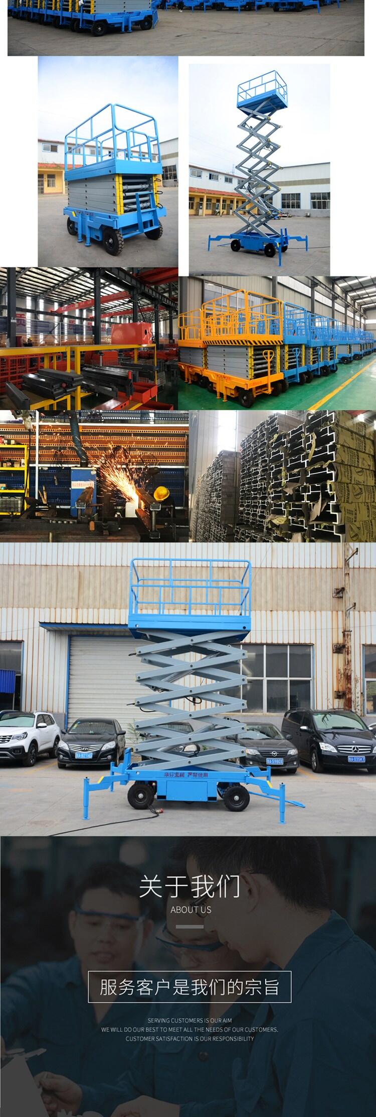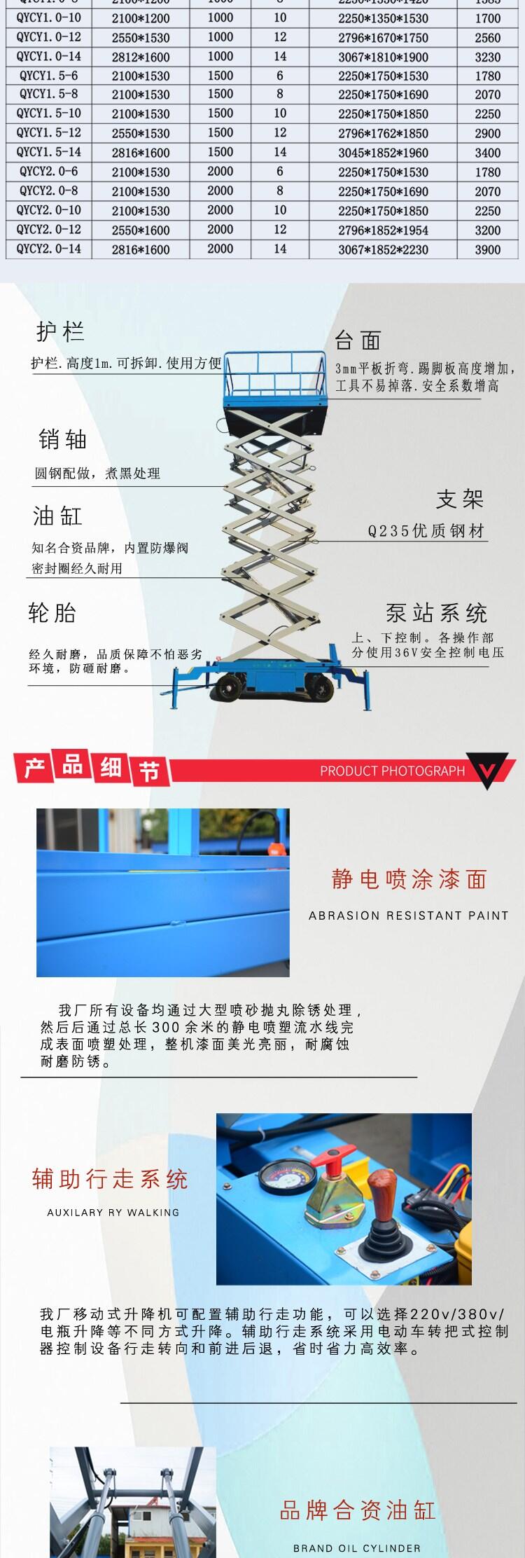 移动剪叉式升降平台主要技术特点:台面钢板折弯、底架及剪叉结构山钢定做高强度矩形管材; 标准冷弯槽做道轨,使用尼龙滑块做导轨轮,接触面大,升降平稳,晃动小;液压油缸 内置防爆阀(防止油管断裂,平台失速下降),采用进口密封圈,经久耐用,不泄露;双层钢网高压油管;升降机专用液压泵站,加装应急下降阀,平台断电可手动控制 下降,内置溢流阀,可防止上行运动时系统压力过高,起到超载保护功能;充气橡胶轮胎; 电路电器、接触器罗列连接,加装热过载保护,缺相保护等安全保护功能;电动上、下电动控制,控制按钮盒加装急停按钮,以最大限度保障财产及人身安全,各操作部分使用24V安全控制电压;轴销圆钢配做,调质处理;抛丸、喷砂 除锈处理,除去钢结构构件表面的锈蚀及焊接飞溅,能使钢构件表面产生一定程度的凹凸不平的效果,增大粉末的附着力;使用静电粉末喷涂;涂层外观质量优异,附着力及机械强度强,色泽亮度高,经久不褪色。