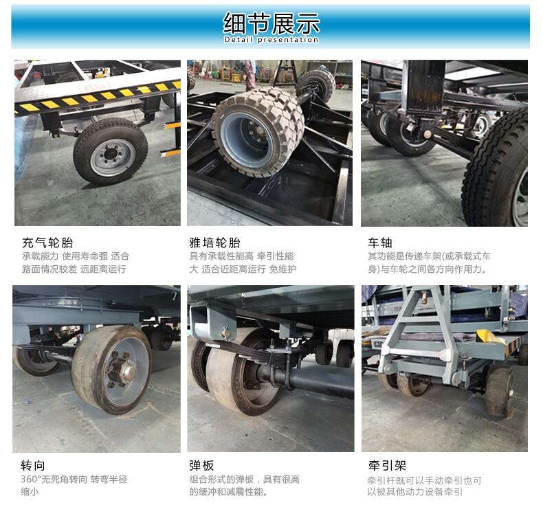 1、采用高弹性实心胎,能增强拖车的承载能力,提高使用寿命,采用空气胎则能减轻行驶过程中因路面颠簸对货物造成的损伤;采用压配胎,因轮胎高度较低,加强了整车的稳定性和拖车的承载力。尤其适合大宗模具的搬运。