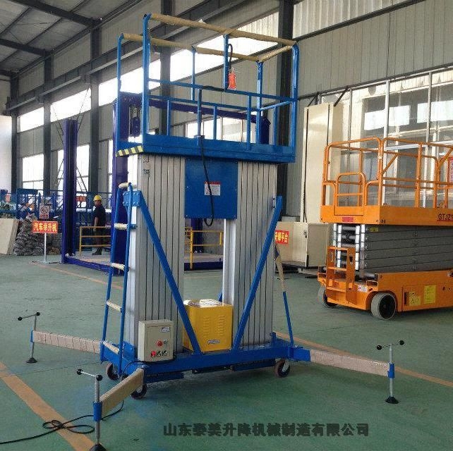 三立柱铝合金升降机:三组桅柱支撑作业平台同步升降,支退结构同单桅柱式平台,具有超大的载重量的工作稳定性。整体升降式护栏装置,强度好,运输时大幅度地降低整机高度,装卸十分方便,通过一次升降即可完成装配或拆卸。该升降机承载能力强,适合于两人(可携带一定的重量工具和材料)同时登高作业;还可根据不同环境订制成各种非标产品,以满足不同需要。