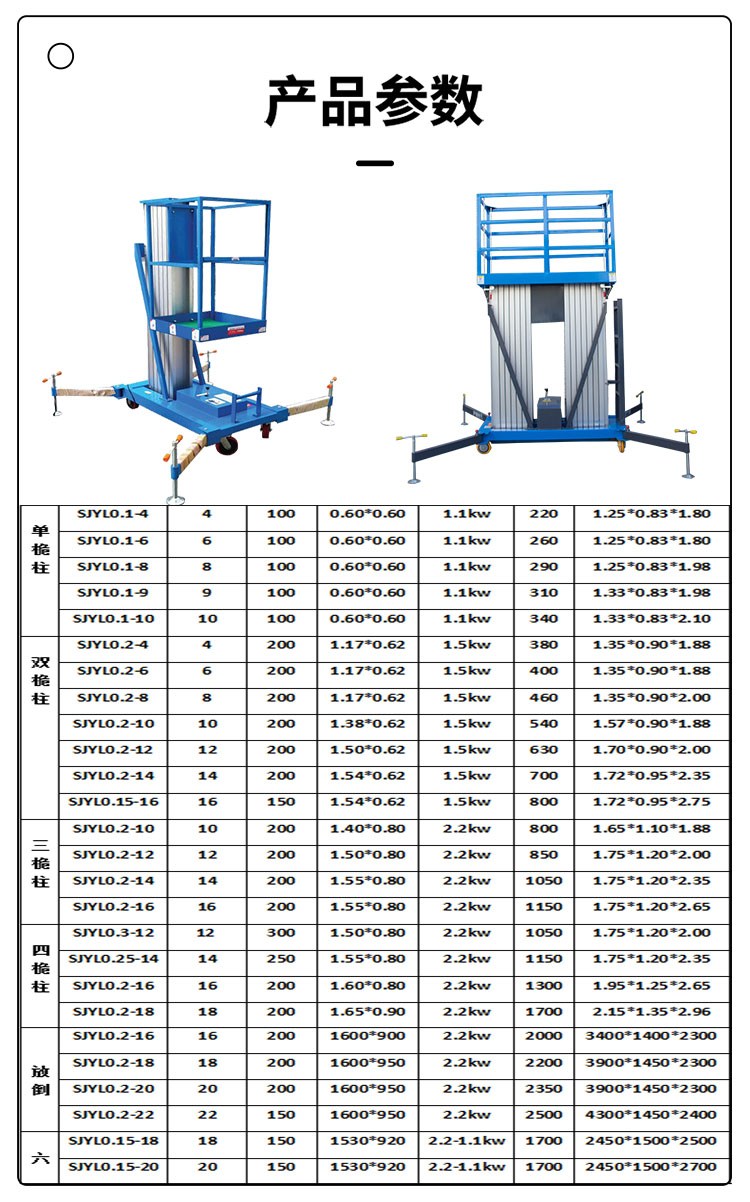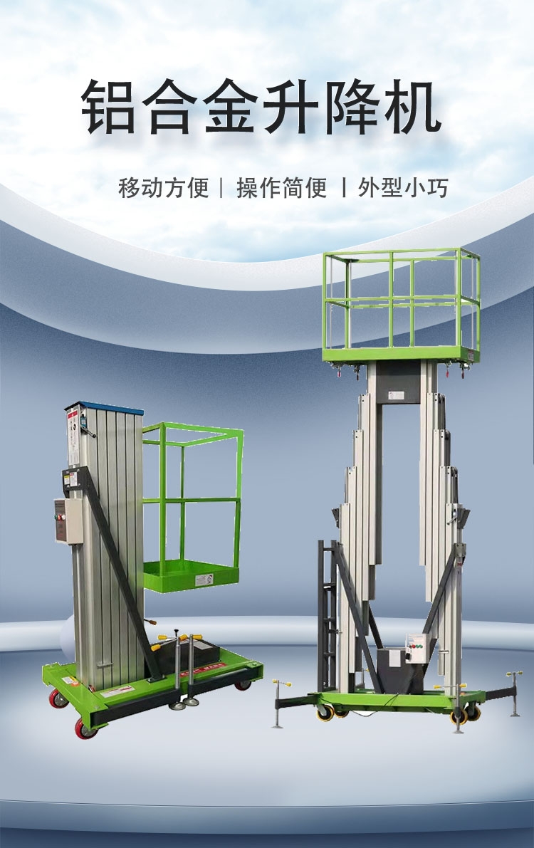 单柱铝合金升降平台结构紧凑,可进入较狭窄的通道及电梯; 主要升降桅柱采用高强度铝合金挤压型材,安全性高且整机重量轻; 各桅柱之间采用自主开发的整体式内置滑块,使得桅柱之间的动态间隙达到最小,升降时运行更平稳、可靠,远远优于普通的独立导轮式支撑结构; 升降驱动链条为双链结构,采用工业用板式链,承载力及安全系数高;护栏结构为整体可收藏式操作极其简单便利; 液压动力单元采用整体式泵站,结构紧凑、性能可靠;液压系统设置应急下降功能,防止停电及意外情况,且应急操作简单; 设备控制电压为直流24V,有效保证人身安全;设备配有漏电保护开关、紧急停止开关、极限电气限位开关等,按钮盒均防水。