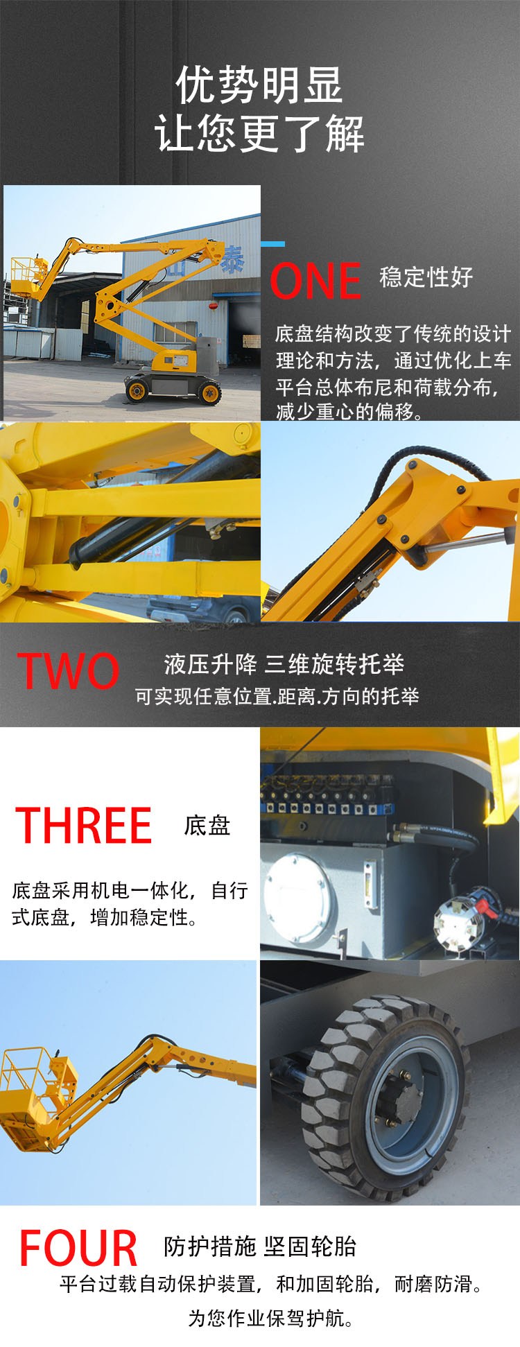 曲臂式升降机能够悬伸作业、跨越一定的障碍或在一处升降可进行多点作业;能够360度旋转,平台载重量大,可供一人或两人同时作业并可搭载一定的设备;升降平台移动性好,转移场地方便;该机采用优质结构钢,单面焊接双面成型工艺,原装进口液压泵站或国内知名品牌液压泵站,高空作业升降平台装有平衡阀、自动保压等安全装置,平台安全可靠耐用。外形美观,适用于车站、码头、商场、体育场馆、小区物业、厂矿车间等地方的大范围作业。