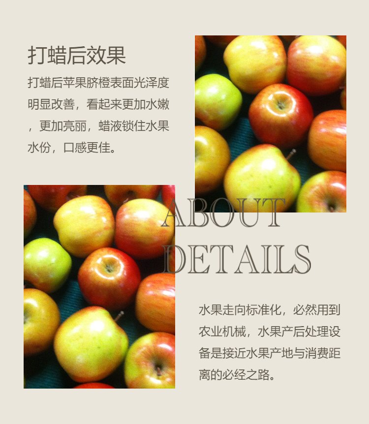 洗打蜡机 苹果清洗打蜡机 柠檬洗果机 脐橙清洗打蜡机设备技术参数: 生产效率:1-5吨/小时; 额定功率:20KW; 电源:380V; 机械损果率:《4;外形尺寸:26.5*5.5*1.9m; 重量:5000KG. 凯祥多功能清洗打蜡机用于苹果清洗打蜡、脐橙 清洗打蜡、柠檬清洗,火龙果清洗、山竹清洗机 设备功能:1、将蜜柚、柠檬、柑桔、脐橙、山竹表面灰尘清洗干净,清除果皮杂质;2、通过对果实的清洗减少病虫害和传播;3打蜡后果品果面洁净,光亮度高,食用蜡对果品形成保护膜,有效抑制水果呼吸,起到保鲜作用;4、果实打蜡后还可以减少果实 水分的散失,避免跑风掉秤,可延长货架期20-30天;5、春皮、裂口和风裂纹果实打蜡后可以起到封闭伤口,防止果实失水皱皮和烂果的作用。6、水果打蜡后保存时间长,保持水果自身