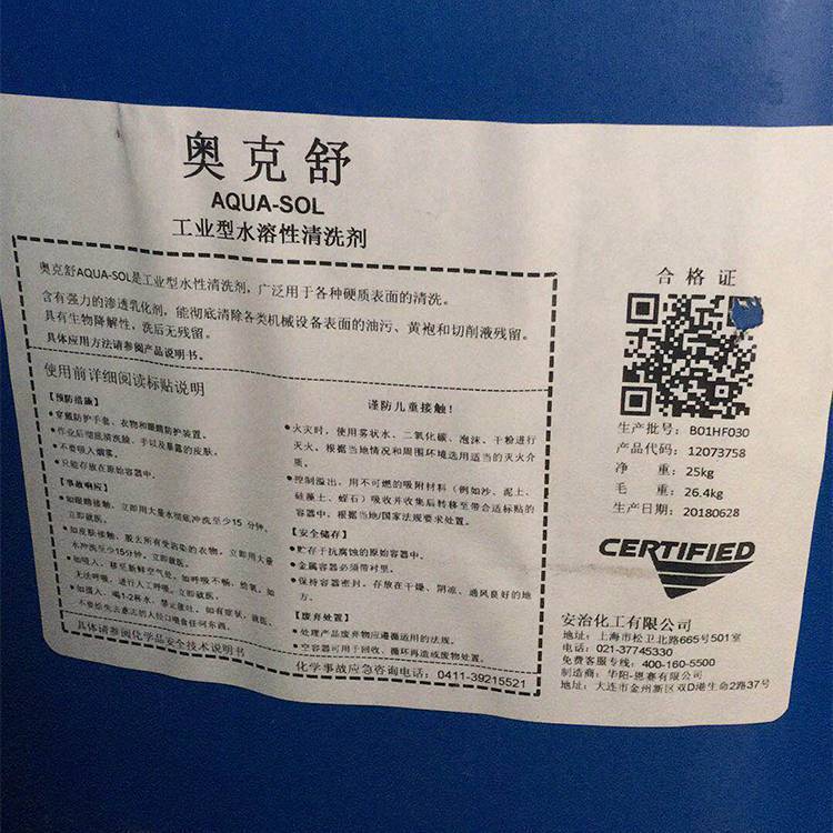 奥克舒AQUA-SOL产品名称:工业型水溶性清洗剂品牌:安治化工外观:塑桶/液体代号:12073758用途:用于清洗机械设备及金属零部件表面的油污、黄袍、墨汁等污垢应用:使用在汽车、铁路、矿山、冶金、机械制造等众多工业场合包装规格:25kg/桶