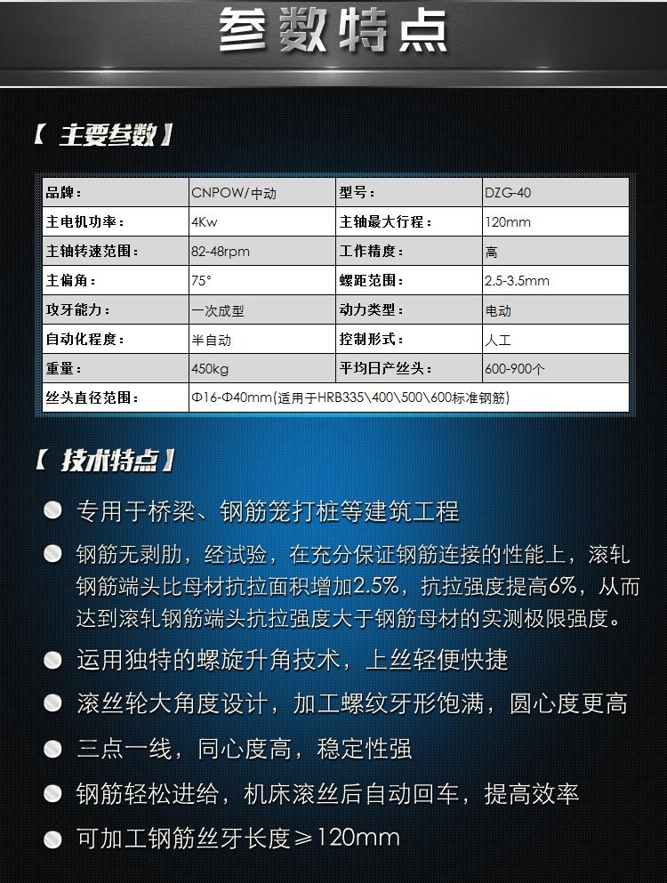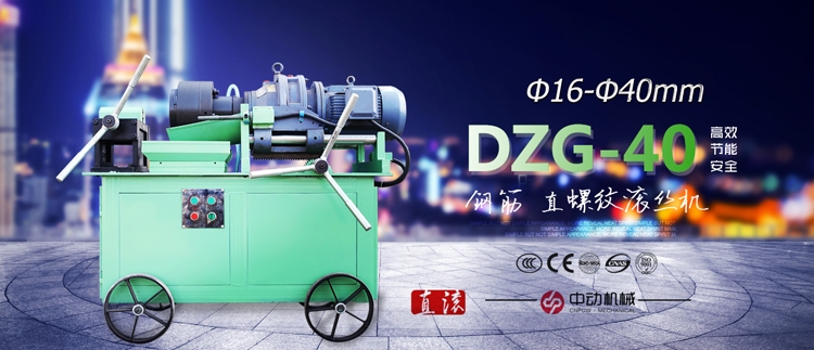 中动DZG-40型钢筋滚轧直螺纹机床主要用于建筑工程带肋钢筋滚轧直螺纹丝头加工,是实现钢筋连接的关键设备,可加工φ16—φ40mm的HRB335、HRB400、HRB500及HRB600级带肋钢筋。