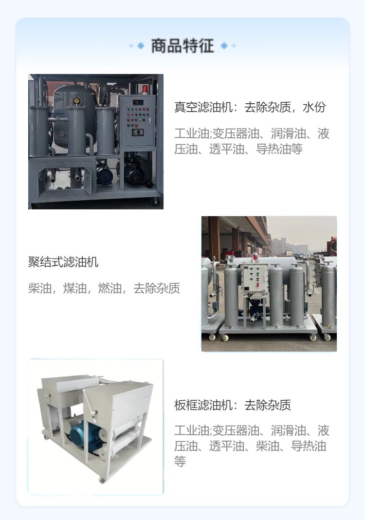 我司主要生产各种型号:真空滤油机,板框滤油机,小推车滤油机,真空抽气机组等工业油品【变压器油、绝缘油、润滑油、液压油、透平油、柴油、导热油等等】净化设备,具有过滤杂质水份、抽油加油、抽真空等功能