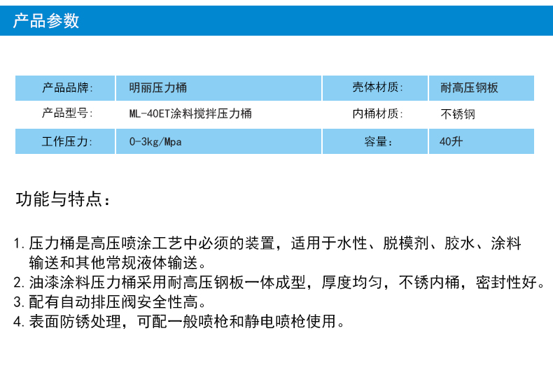 明丽经济型无搅拌压力桶 10L/20L/40L油漆胶水脱模剂喷涂压力罐 型号 | ML-10ET/20ET/40ET压力桶 | ||