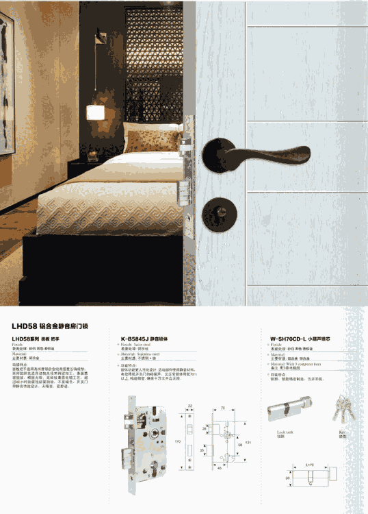 门锁面板把手采用航空铝:材质温和,永不生锈,把手手感温和(使用舒畅),线条流畅,颜色亮丽;各种时尚、流行款式为您的新家锦上添花,(流行、简约风格之)喜欢高性价比的您会喜欢,锁体采用静音5845锁体,款式多样。