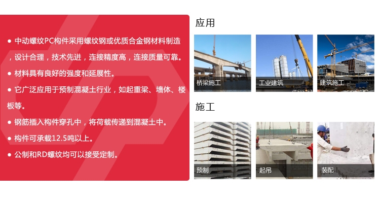 中动机械螺纹PC构件采用优质合金钢或螺纹钢筋制造,设计合理,技术先进,连接精度高,连接质量可靠。