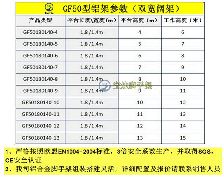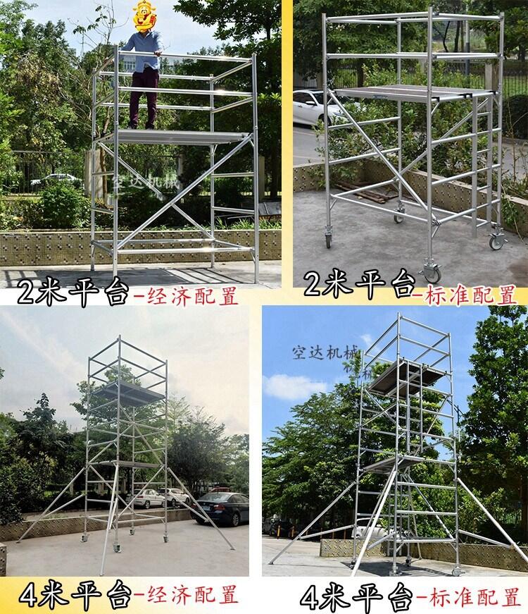 三.客户需求:因为铝合金脚手架平台是以组合形式来完成整个塔架搭建的,所以客户需要根据自己实际需要的作业高度来确定铝合金脚手架所需要的米数,从而制定出所需要搭设的铝合金脚手架平台方案。所以铝合金脚手架价格基本公式可定义为:基础框架+1套脚轮+1组围栏+1块踏板+1套外支撑。