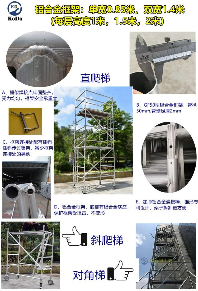 二.配置:铝合金脚手架产品基础框架配置是由基础焊接框架以及4只可调节脚轮,6条长的横杆,2条斜杆,1个1.8米开口踏板,2个围栏(防护栏)组成。其次就是斜支撑,斜挂梯,平台板。(其中脚轮,围栏和平台板非铝合金材料制成,它们的制作成本也是决定铝合金脚手架价格的一部分)。