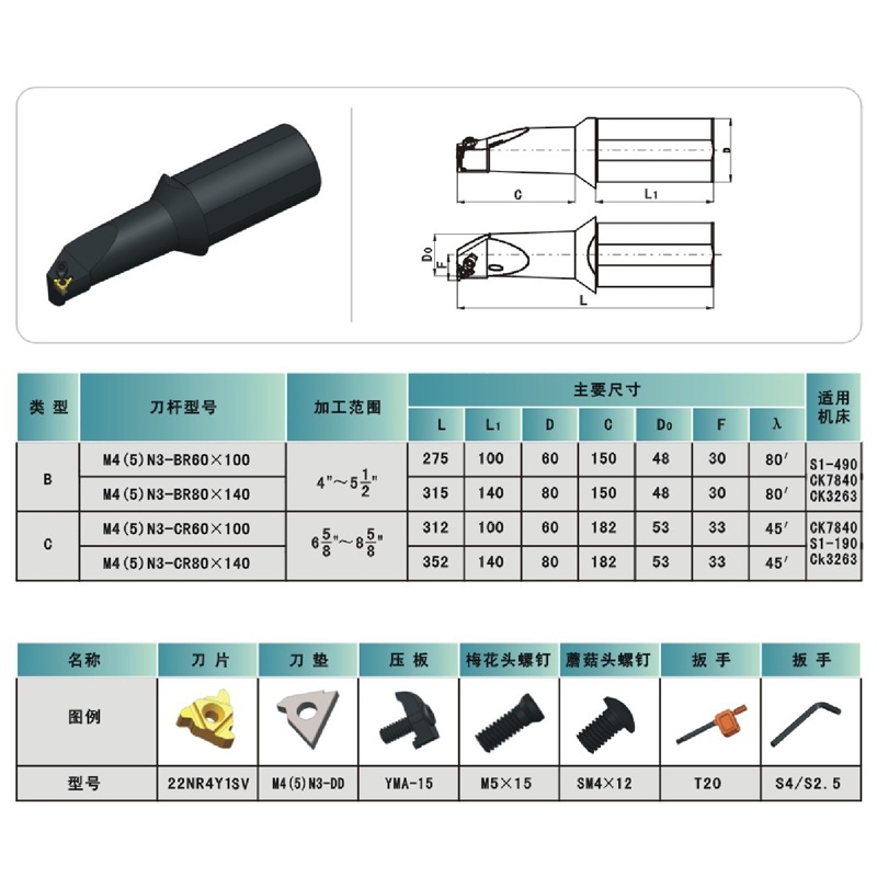 石油管螺纹刀具钻杆Ⅱ型内螺纹刀片用圆柄刀杆M4(5)N3-BR80×140