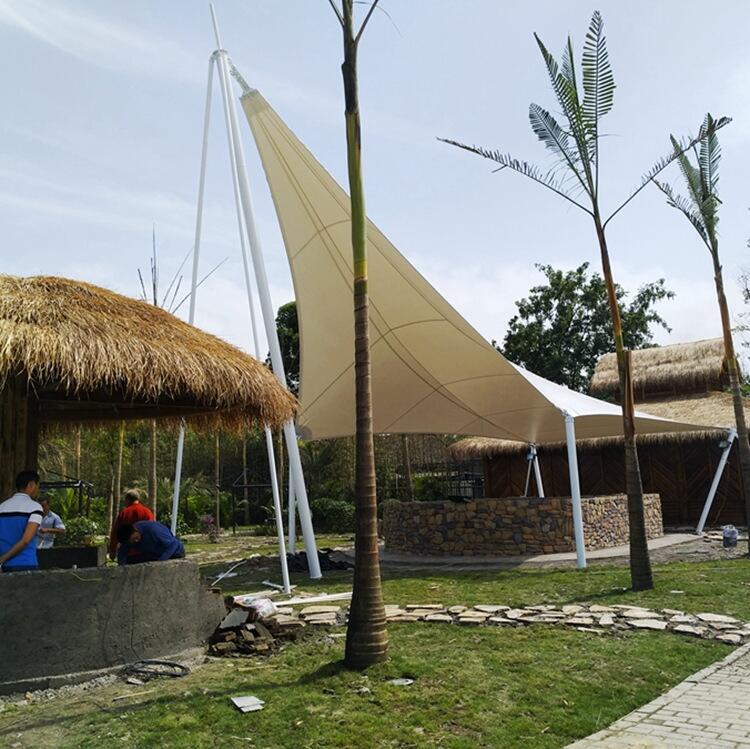 膜结构造型独特、轻巧、极富时代气息,用来制作街头的小品也十分合适 ,像是步行街的雕塑、街头绿化的凉亭,或是广场、公园的入口等等,充满个性的造型很有标志性。另外膜结构易于拆装、移动,施工便捷,在临时性建筑的塑造上非常方便。