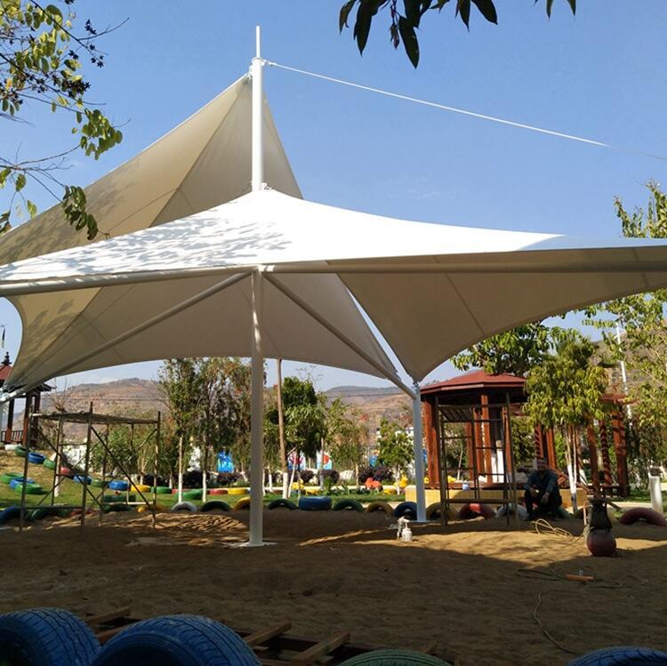 膜结构可实现大跨度 ,膜材较薄 ,可任意弯曲形成曲面 。 这就给了设计师广阔的空间来发挥他们的想象力,打破传统建筑纯直线的桎梏 ,使得他们能够更加随心所欲地表达 自己的想法。膜结构的建筑因此具有外形自由而流畅 ,以曲面为主,色彩斑斓,造型变化丰富 ,充满结构之美等特点 ,其展示语言和展示手法异常丰富 ,充满创造力和艺术性 。这就使得膜结构在景观领域的应用范围更加广阔 。膜结构不仅可以做供 小区居民遮风避雨 、休憩活动的小品 ,满足人们户外活动的需求 ,而且当它与城市风景 、园林风景等不同类型的景观结合时 ,能获得不同的景观效果 。 特别的是 ,它的造型可变而随机,可利用在地形复杂的山地公园或街道建造一些步行的廊道和休憩凉亭。 或是应用于密闭性可变的场所 ,例如停车场 、游泳池 、步行街等 ,可以根据天气或需求的变化而改变其闭合状态 ,例如由全封闭改为半封闭等 。