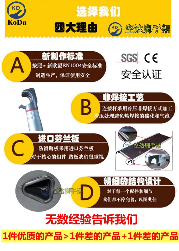 深圳空达机械设备有限公司严格按照欧盟EN1004-2004,美国ANSI等相关标准设计、制造,产品通过TUV GS和CE质量认证。此外,我厂已通过ISO9001质量管理体系认证。