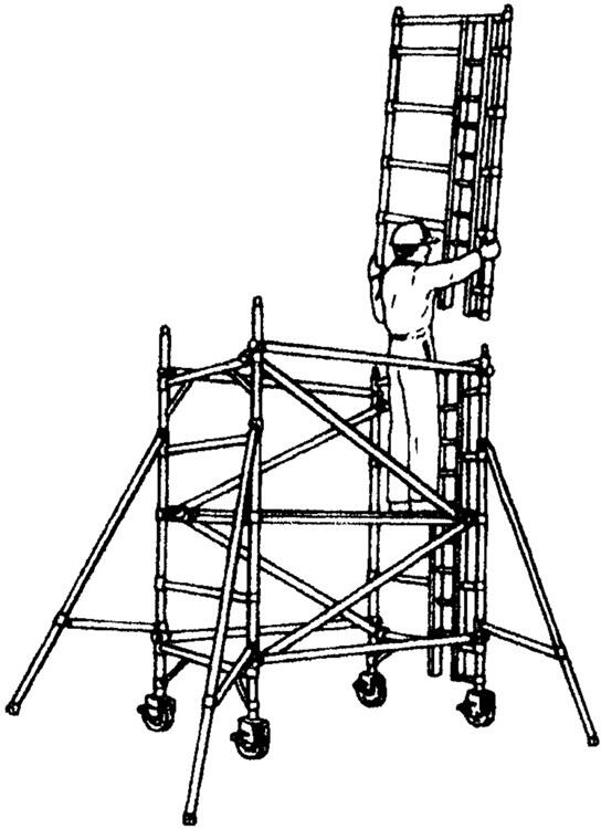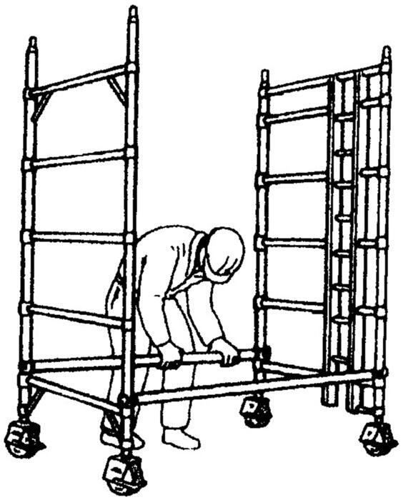 10、作业完毕后,拆除铝合金脚手架,拆除应从顶层向下逐步拆除,拆除顺序为:顶层作业平台踢脚板——作业平台护栏扶手、护栏架——作业平台板—— 从上而下依次拆除各层(除一层)斜撑、门架——地面外支撑——一层斜撑、横撑及门架——拆除脚轮和可调脚——搬运脚手架构配件离场