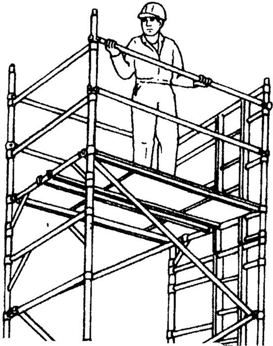 7、在倒数三横杆上搭设临时平台板,搭设护顶层作业平台的护栏架