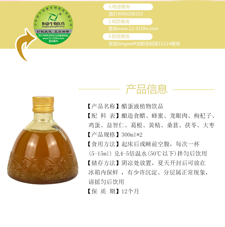 原料与配料 | 醋、鸡蛋、蜂蜜、桑葚、枸杞、黄精、茯苓、大枣 | ||
