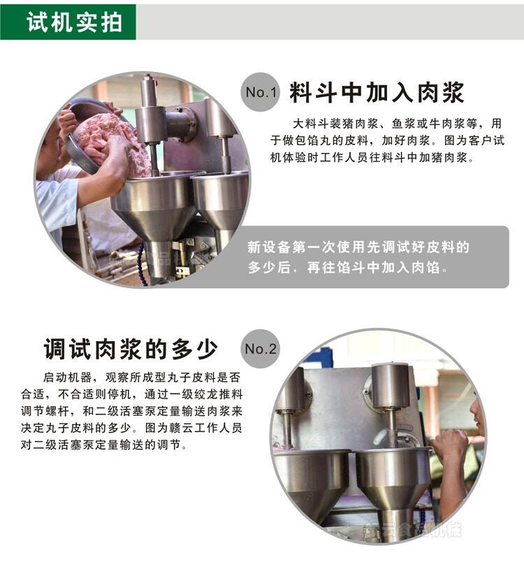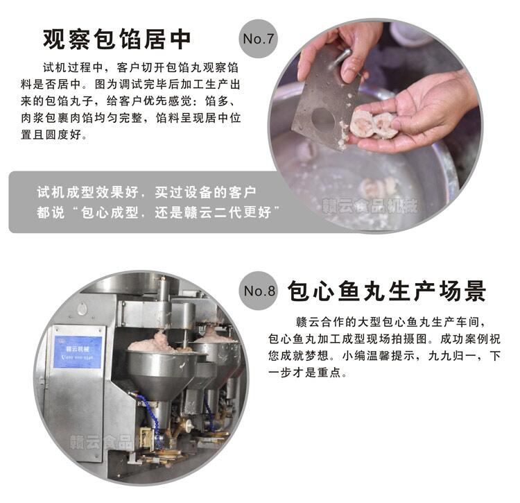 第三代包心肉丸机是在赣云二代包心肉丸机的基础上,对二代包心机的成型切割部位进行优化提速处理,达到每分钟200粒的成型速度是二代包心机的两倍,且推料控制方式还是选用一级绞龙推料和二次泵定量输送相结合的原理,馅料控制改塑料螺盖为不锈钢抗氧化特殊处理螺盖,馅斗新增绞龙挡板,可有效防止肉馅余留馅斗,更易肉馅的向下挤压输送作用,成型旋转齿轮上新增润滑滴管,弥补了二代包心机成型区域局部润滑切刀的缺陷,做出的包心包馅丸表皮光滑,个体圆且大,成型速度快,无小尾巴等优势。综上优势pk二代和目前其他厂家新款式包心肉丸机,故称之为赣云第三代包心肉丸机!