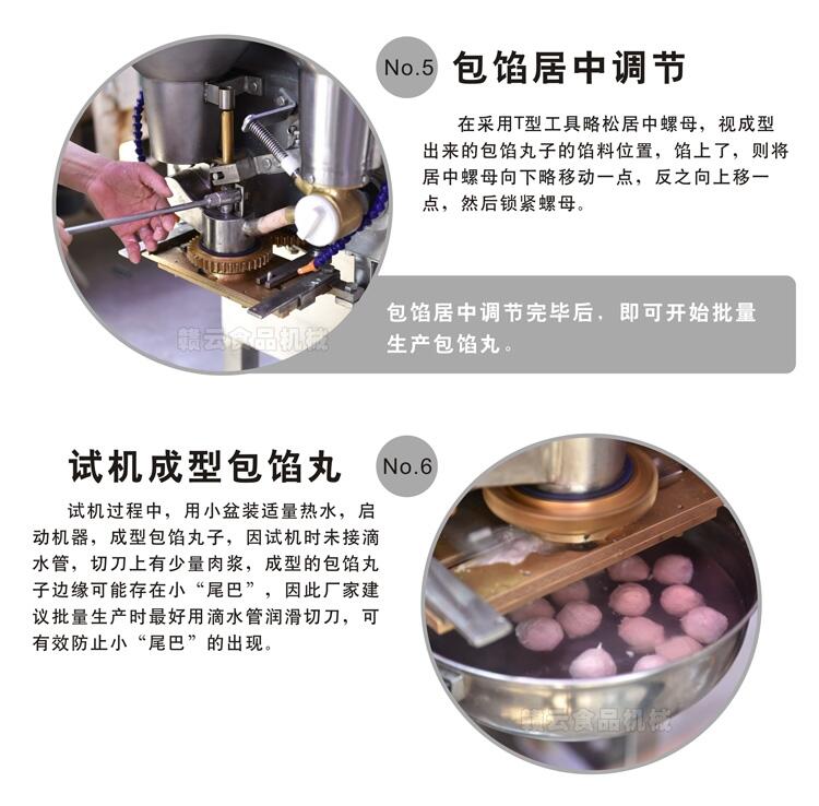 成型模具:28mm、30mm、32mm三种规格,其他规格可定做。本机可生产直径为28mm-36mm直径的包心丸子,因此定做的规格直径不能超过36mm,也不能低于28mm.