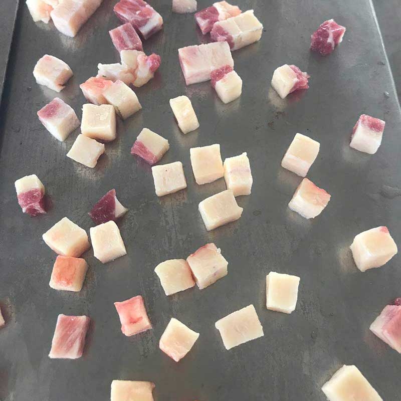 设备机壳,切割刀栅均采用不锈钢材料制成,切刀采用双刃切削,工作效率高,切割的肉丁规格小3mm,大30mm。调整厚度切割旋纽,可对推杆进行无级调速,以满足不同切割厚度的要求。本机可适应-5℃至常温肉料正常切割。
