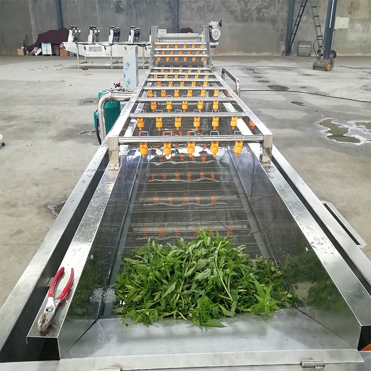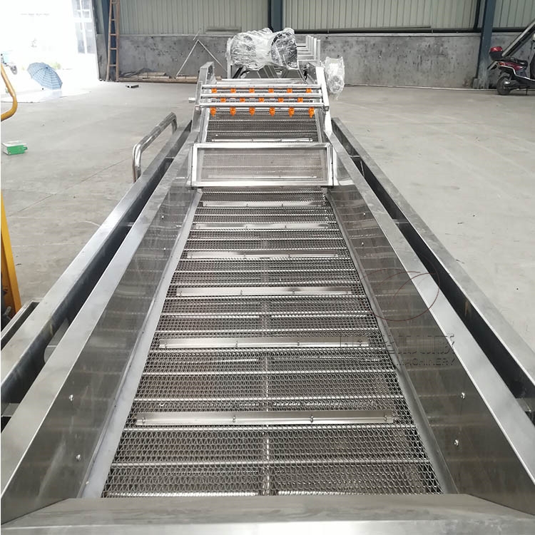 菠菜清洗机是利用箱体前部分设备,箱体中适量的水经过加热管将水温加热,由气体和水的结合形成气泡,物料在经过箱体时会与气泡机里的气泡结合做上下左右做翻滚状态,物料在箱体中不断的进行翻滚并随网带不断向前推进,从而达到一个对原料进行清洗的作用。我公司为了原料达到彻底清洗,还安装了高压喷淋设备进行清洗,使物料在箱体翻滚状态情况利用高压喷淋对物料进行打压保证物料在水里进行上下左右的清洗,.网带输送出口处也设有高压喷淋让物料离开出水面时进行二次喷淋,高压喷淋里的水是由另外一根水管的水接入的,不同于槽体里的水,同时高压喷淋在保证产品清洁度的同时,更能及时给设备槽体内补充水源,保证设备内的水源清洁度,达到清洗效果。物料在经过箱体时清洗下来的泥沙会随着网带移动掉落到槽体,等到沉淀物比较多的时候在把排水阀门打开把泥沙排出,这就是气泡清洗机整个的清洗过程。