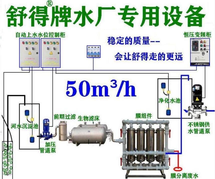 随着社会条件的不断提高、农村50年代兴起的老式水厂将逐渐淡出人们的视线、将被纯生态全生物膜模式组合式设备取而代之。舒得牌生活饮用水处理设备农村水改水厂设备不用添加任何化工净水药剂不用添加絮凝剂沉淀更不用添加氯化物消毒设备自带杀菌消毒是真正的适用于农村新水厂建设老水厂升级改造 设备全程全自动生产线全自动反冲洗全自动正冲洗可远程视频化监控。舒得牌净水设备是主要生产井水河水山涧水深度处理的设备集过滤-净化-软化-消毒-杀菌于一体的组合式设备,用途广泛适用于中国、东南亚各国、中东各国、非洲各国等区域只要是淡水都可以配置,自信源于专业。市场的宗旨是提高仅依靠井水河水等普通淡水(含普通自来水)生活的家庭、小吃快餐公共食堂酒店宾馆等餐饮行业及公共服务区域,住宅小区集体供水,农村新型净化水无菌水厂建设老水厂改造,成本低投入少占地面积小使用寿命长等特点。地下水除铁除锰、工业用于食品级蒸汽锅炉、无压锅炉、供暖锅炉等供给无垢软化水、印染企业、浴室禽畜养殖等。