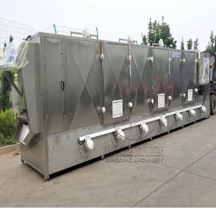 多层烘干机又称隧道是烘干机,高度分为3层.5层.7层.9层,宽最多3米,网带长度有20米,这个尺寸可以根据客户实地厂房进行尺寸定制,烘干机大约1小时出1吨料,产量大。