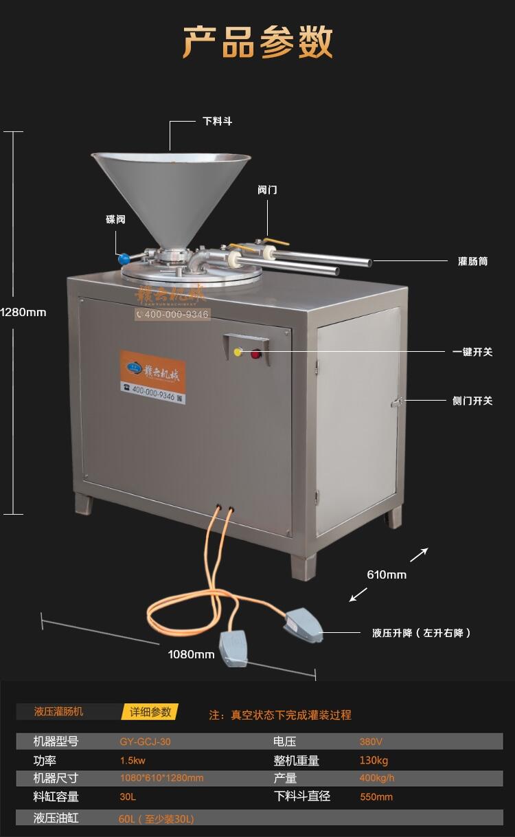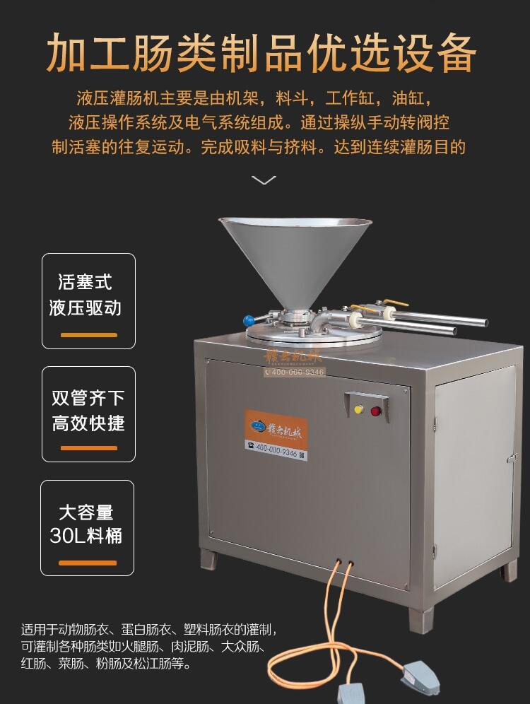 肉肠有的里面灌的是肉片、有的是肉浆、有的是肉末,有些灌肠机只能灌肉片、有些灌肠机只能灌肉末、有些灌肠机只能灌肉浆,在这里给大家分享的这款叫做赣云牌30L液压灌肠机,他是一款全能型的灌肠机器,因为他既可以灌肉片、也能灌肉末,还能够灌肉浆。接下来小编通过图片和大家分享一下灌腊香肠的机器: