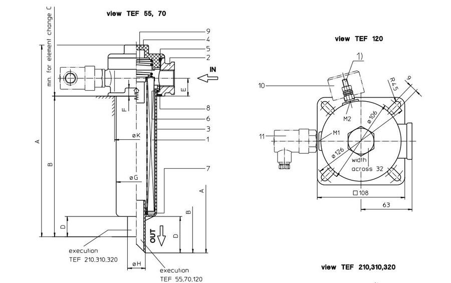 回流线过滤器系列TEF 55-320的工作压力高达10bar。。压力峰值将被吸收 有足够的安全系数。