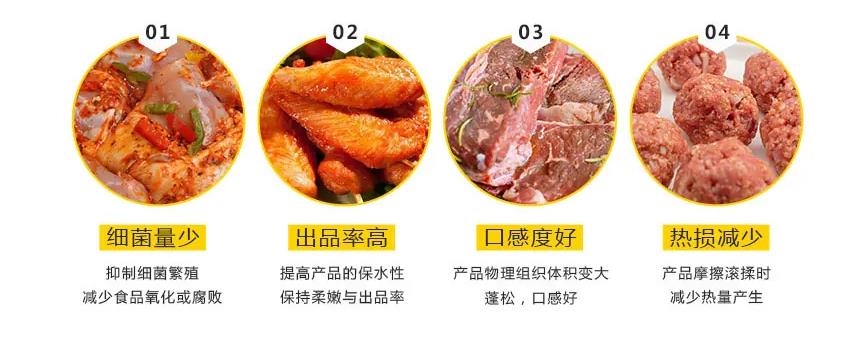 滚揉机适用于加工火腿、肉肠、牛羊肉制品等肉类食品。通过滚揉,腌渍液能够被有效吸收,肉质结合力强,截面承受力强,保水性好,口感更鲜嫩、色泽自然美观,可大大提高出品率,增强肉制品的高品位。