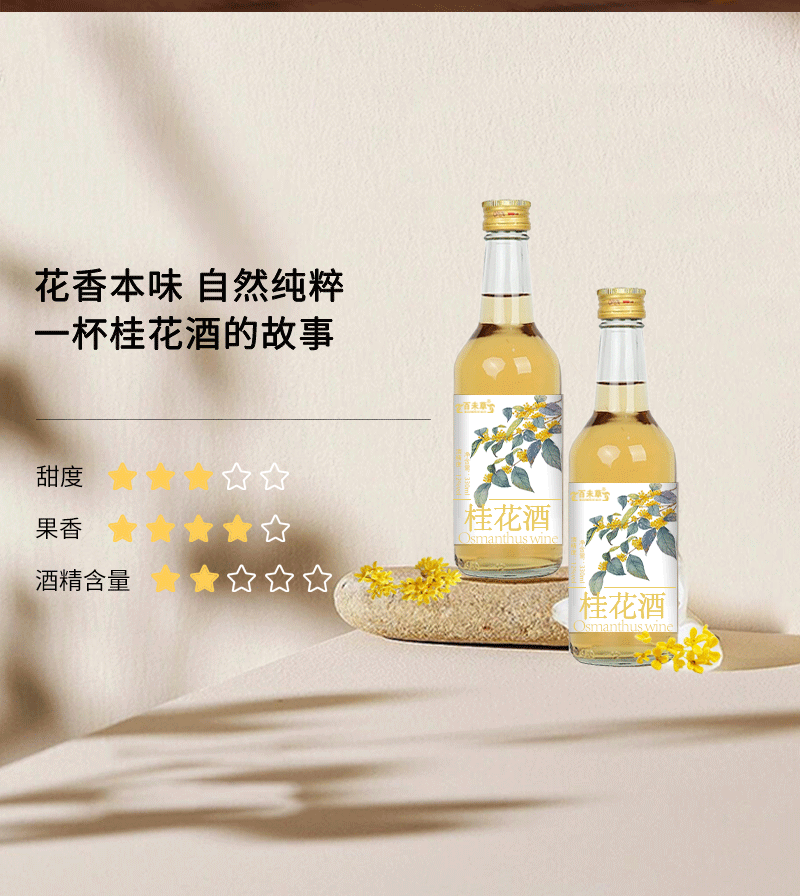 -主要原料:通常采用新鲜或干桂花,搭配糯米、山葡萄、米酒或白酒作为基酒。