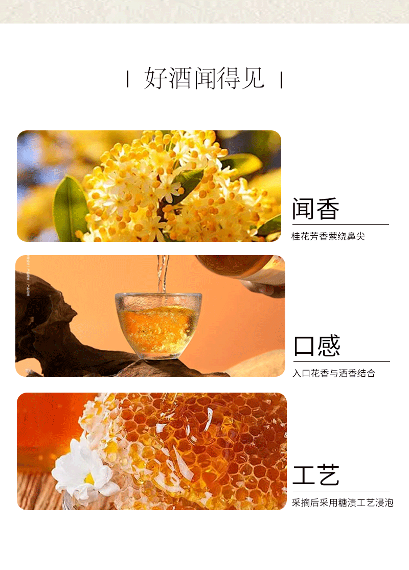 香气:具有浓郁的桂花清香,部分品种还带有山葡萄或米酒的醇香。
