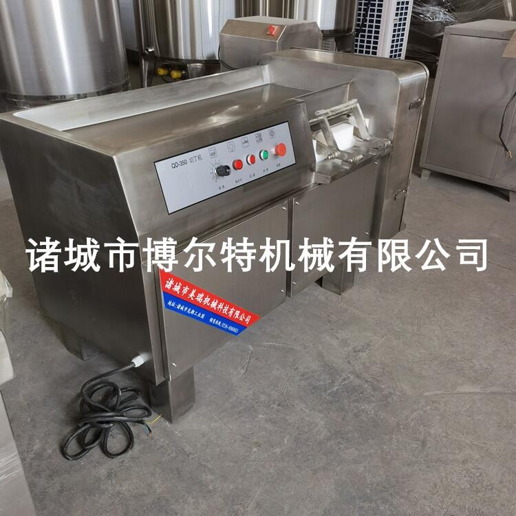冻肉切丁机 猪喉管切条机 鲜肉冻肉切丁机可以实现无骨肉类的切丁加工和果蔬类的产品的切丁加工的,也就是可以当切肉机使用的同时还可以实现切菜机的一个功能的,这款机器对于入料的原材料是有要求的,需要根据入料槽尺寸来确定的,如果是冻盘比较大的产品的话是可以配套冻盘切块机或者是据骨机来使用的。