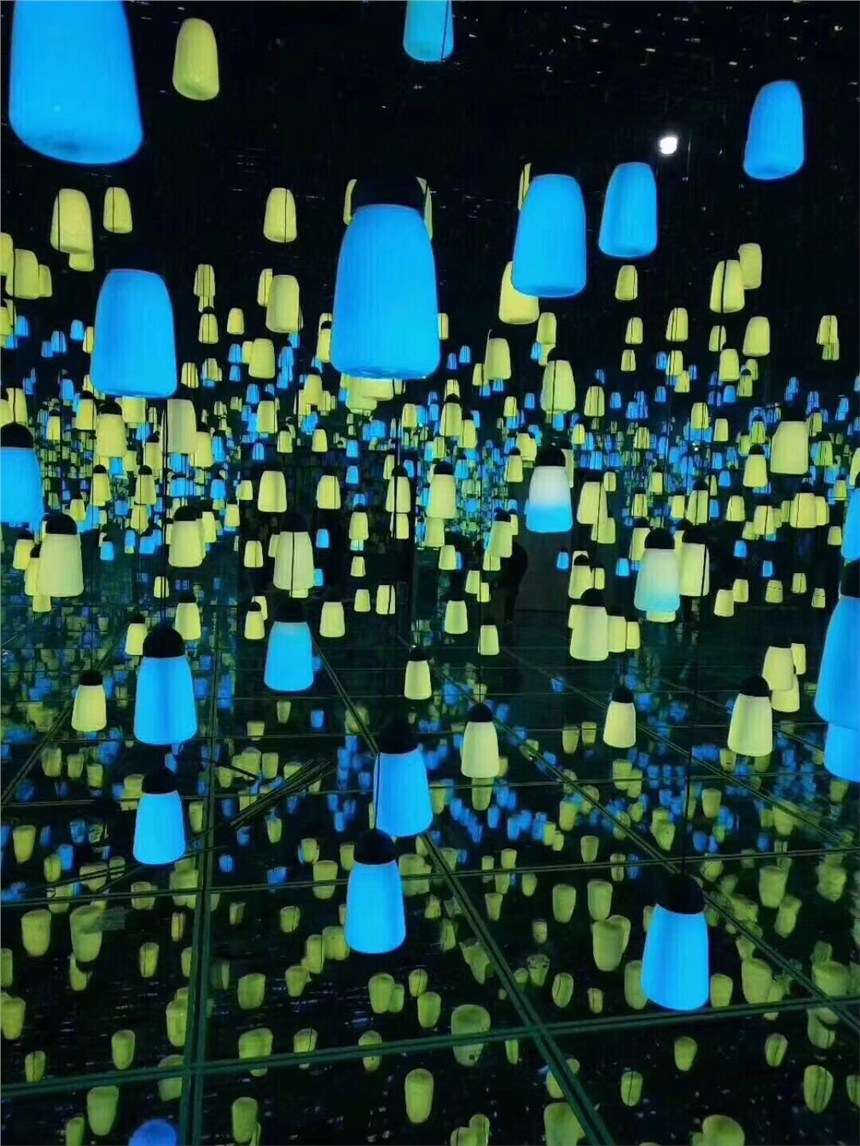 掀开布帘的一瞬间,缤纷的色彩猝不及防地涌向你的双眼,360度的镜像、空灵的配乐,让你如同坠入了一个迷离的幻境!数不清的灯盏高低错落地凌空悬挂,如同呼吸一般变换着色彩,可能梵高所见的星空就是这样的吧!