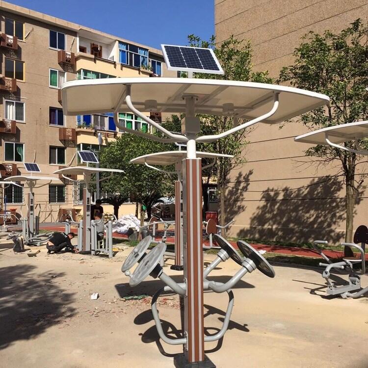 ·顶部装有太阳能板,太阳能系统支架立柱为Φ48×3mm优质钢管,与遮阳棚采用法兰盘连接,?防止雨水浸入造成电路短路烧毁;太阳能板采用单晶光伏板,通过控制器给锂电池充电,一次性充满可使用70小时以上,供给2盏5W的LED灯夜间照明,可以在夜间进行锻炼。