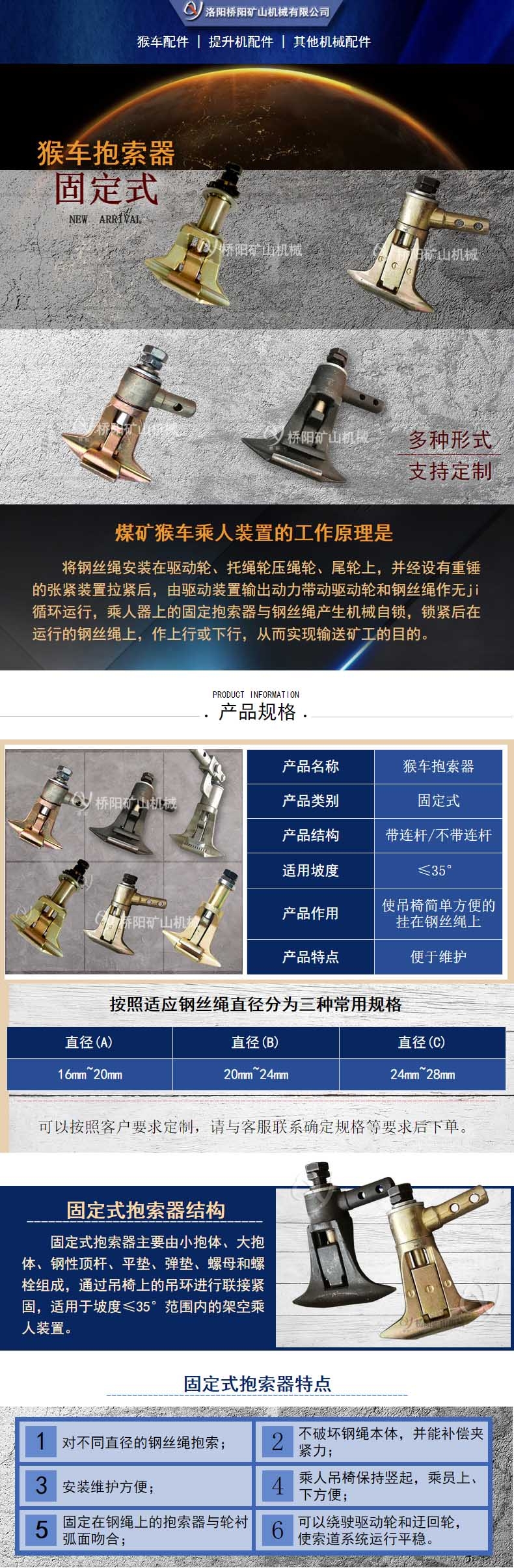 洛阳桥阳矿山机械有限公司生产各种类别和规格的猴车抱索器。抱索器分为:固定式、活动卡钳式、活动摩擦式、可摘挂式抱索器、水平拐弯式。通常情况下常采用固定抱索器,该款抱索器即能满足自身与钢丝绳之间足够的压紧力,又能保持两者之间有一定的弹性余量。
