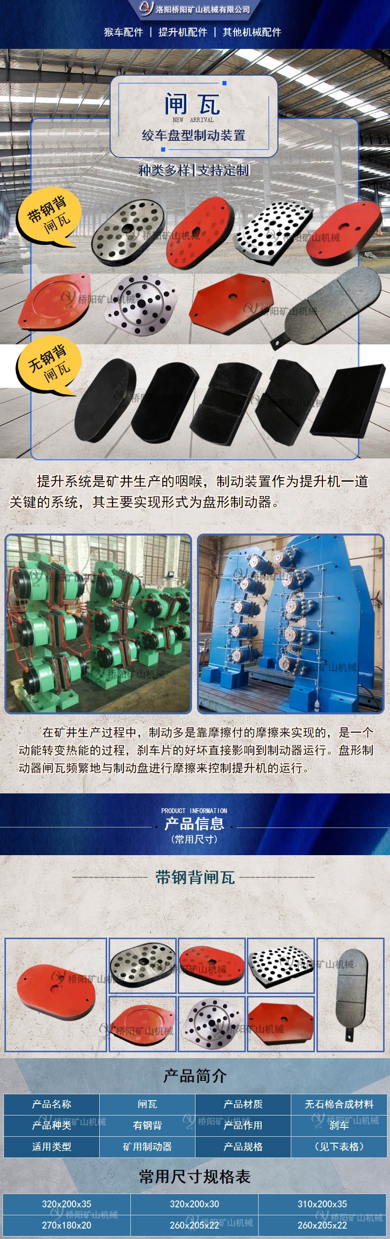 提升系统是矿井生产的咽喉,制动装置作为提升机保障系统,其主要实现形式为盘形制动器。制动多是靠摩擦付的摩擦来实现的,是一个动能转变热能的过程,用作摩擦付的摩阻材料,是制动器运行的保障。闸瓦是矿井提升机制动器的零件之一。在矿井生产过程中,盘形制动器闸瓦频繁地与制动盘进行摩擦来控制提升机的运行。