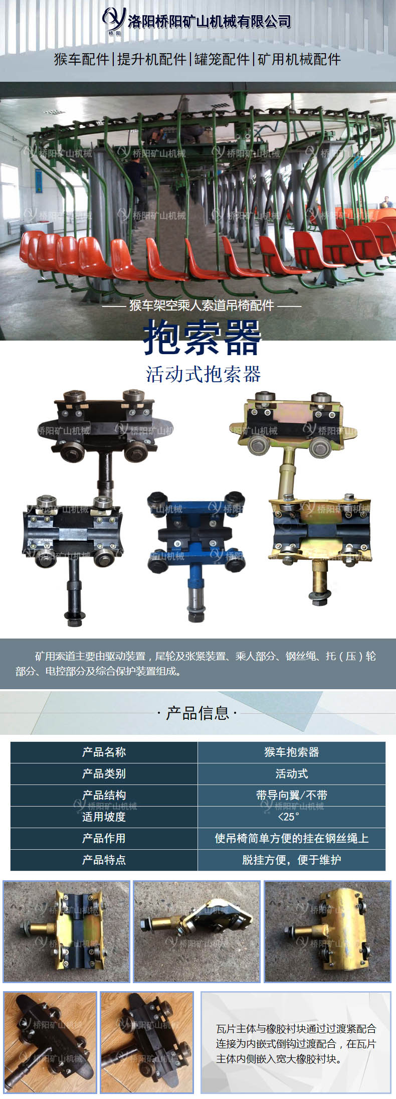 活动式抱索器的特征在于:瓦片主体与橡胶衬块通过过渡紧配合连接为内嵌式倒钩过渡配合,在瓦片主体内侧嵌入宽大橡胶衬块。滚轮轴承组或从动轮组为:瓦片主体背面前端两侧各设有一个滚轮轴承,组成滚轮轴承组。